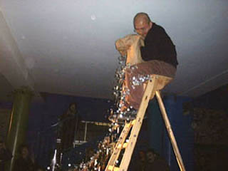作品形態:パフォーマンス 発表月日:1999年1月14日 機 材:1円玉、25サンチームコイン、脚立、ドンゴロス袋、麻ヒモ、ハサミ イベント: ACTE KOBE1999 会 場: マルセイユ マルハンブラシアター
