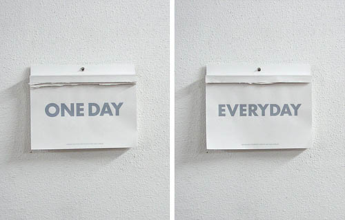 「ONED AY」「EVERY DAY」「TODAY」「YESTERDAY」「TOMORROW」とプリントされた紙をそれぞれ365枚ずつ綴じて日めくりカレンダー状にした作品。各ページ下には1〜365までナンバリングが施されている。作品の所有者は1日1ページずつを破り捨て(展覧会出展時には鑑賞者がそれを代行)、最終的には作品そのものが消費・消滅する。「日めくり」という行為を通して、毎日というルーチンな(もしくはそうではない)時間的範囲、今日という日の相対的な位置、もしくはその背景にある時間の流れを顕在化させる。